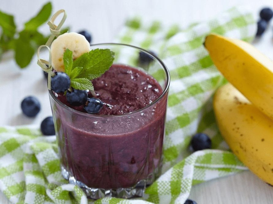 1 muz, 1 su bardağı yaban mersini, 1/2 su bardağı şekersiz hindistan cevizi sütü, 1 yemek kaşığı bal ve misket limonu suyu, 1/4 çay kaşığı badem özü ve 1 su bardağı buzu karıştırın.